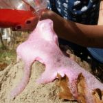 - When you are ready, add the vinegar and food coloring solution to the top of the bottle and watch the eruption take form.