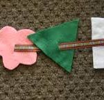 4. Slip one shape of prepared felt onto the button snake through the hole, and slide it all the way to the end of the ribbon.