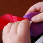 5. Tie a knot at the end after the first piece of felt is added. This will create a nice end piece for your snake and allow the other felt pieces to remain on the ribbon until they are unbuttoned off.