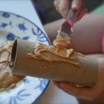 - Smear peanut butter on the empty toilet paper tube with your spoon or butter knife.