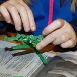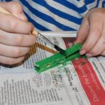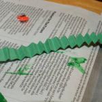 3. While the clothespin is drying, cut a 1/2 inch wide strip of green construction paper and fold it back and forth accordion style and set aside. You will trim this to fit the length of the back portion of the clothespin when it is time to assemble.