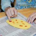 2. Use your index finger and your brown paint to stamp several finger prints around the surface of the yellow oval. Allow to dry. When dry, repeat this process on the other side of the yellow oval.