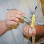 4. Use your index finger and brown paint again to create brown spots on all three of the dry yellow painted clothespins.